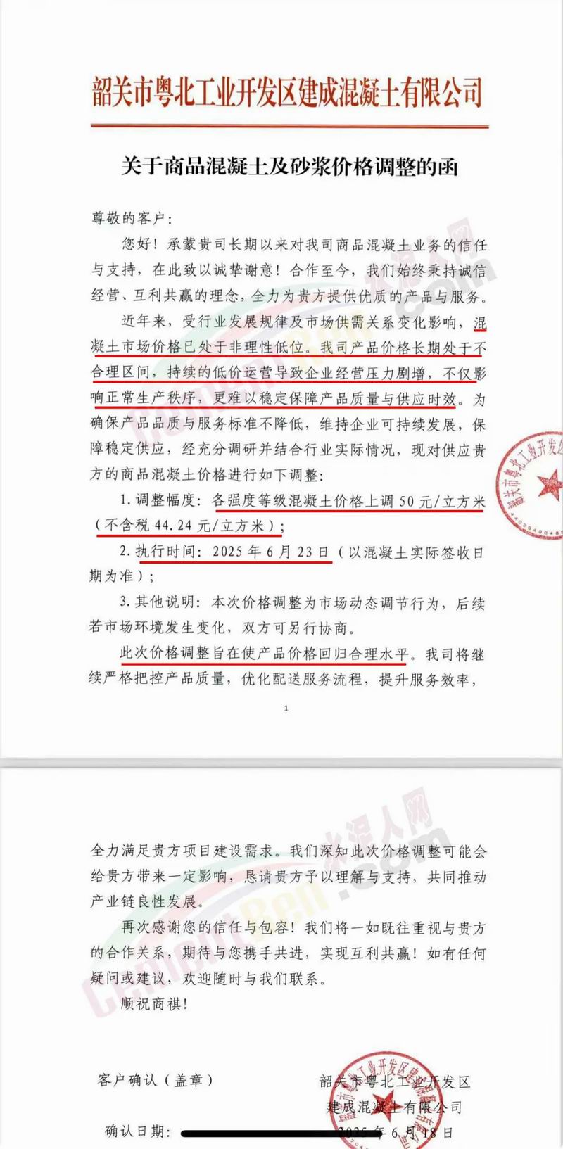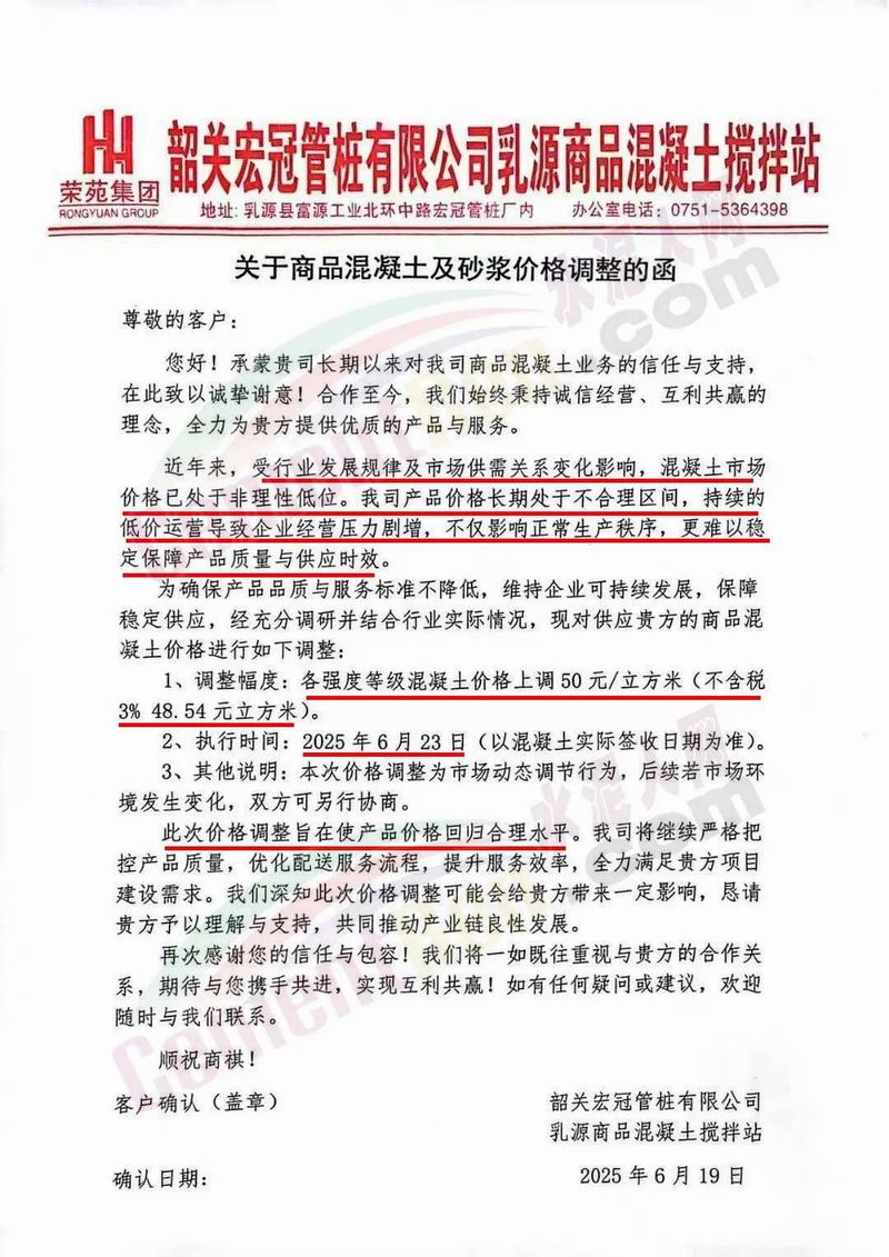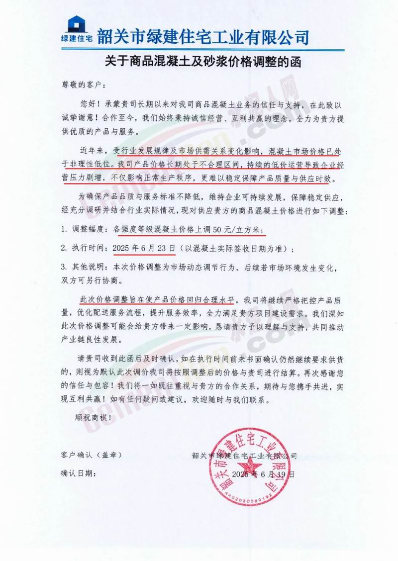 近日,乳源瑤族自治縣宏建商品混凝土有限公司、韶關(guān)市城興住宅工業(yè)有限公司、韶關(guān)市三創(chuàng)混凝土有限公司等近10家商品混凝土企業(yè)聯(lián)合發(fā)布調(diào)價函,宣布自2025年6月23日起,各強(qiáng)度等級混凝土價格統(tǒng)一上調(diào)50元/立方米。這一舉措不僅引發(fā)了行業(yè)震動,更被視為混凝土企業(yè)在長期低價競爭后的一次“絕地反擊”。