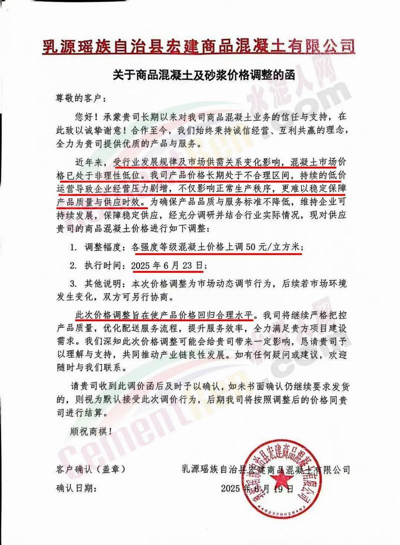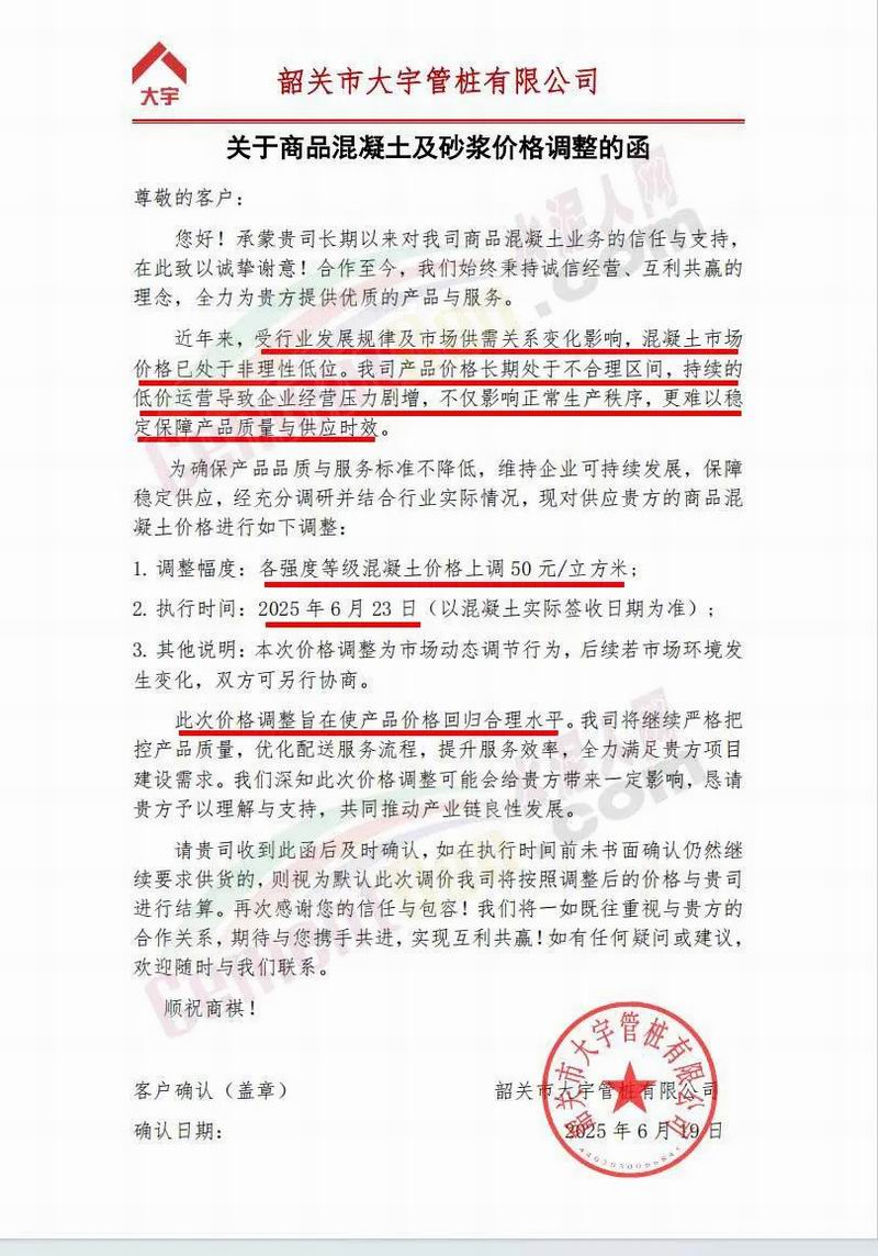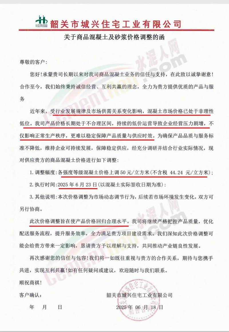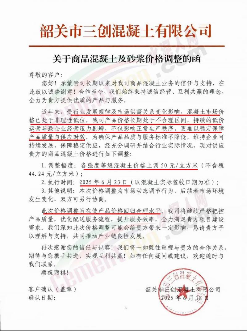 近日,乳源瑤族自治縣宏建商品混凝土有限公司、韶關(guān)市城興住宅工業(yè)有限公司、韶關(guān)市三創(chuàng)混凝土有限公司等近10家商品混凝土企業(yè)聯(lián)合發(fā)布調(diào)價函,宣布自2025年6月23日起,各強(qiáng)度等級混凝土價格統(tǒng)一上調(diào)50元/立方米。這一舉措不僅引發(fā)了行業(yè)震動,更被視為混凝土企業(yè)在長期低價競爭后的一次“絕地反擊”。